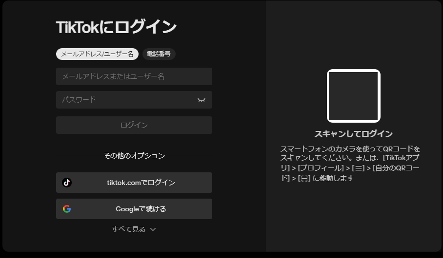 (メールアドレスやユーザー名でのログインもいいですが、オススメはQRコードをご自身のスマホでカメラから読み取ってログインする方法です、この方法が一番簡単で便利です。)