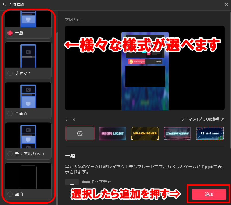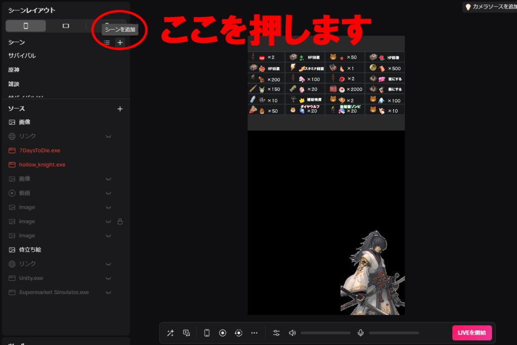 シーンとは、ライブ配信の画面構造をまとめた一つのくくりです。